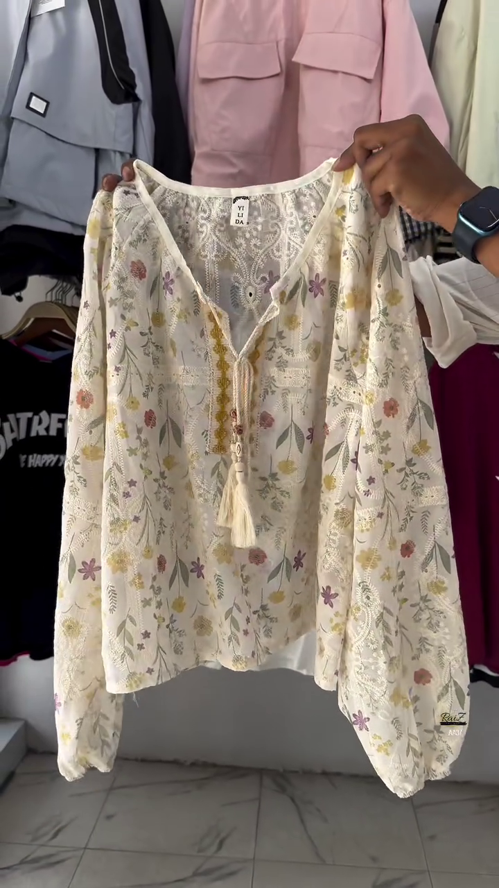 Soft Floral Print in Pastel Hues: The beautiful floral pattern in soft pastels gives this top a light, airy feel, making it perfect for warm days or layering in cooler weather. The gentle color palette adds a serene, relaxed vibe to any outfit.