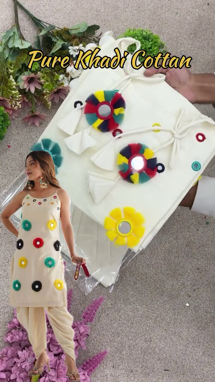 Pure Khadi Cotton Festive Suit – Elegant Off-White Ethnic Wear with Colorful Mirror Embroidery & Tassel Detailing for Traditional Celebrations