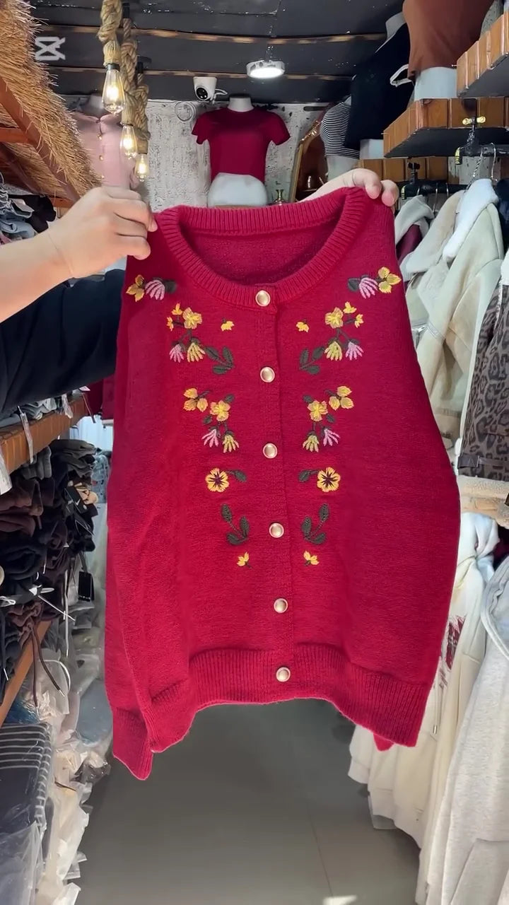 Elegant Winter Essential – A beautifully designed button-down cardigan featuring delicate floral embroidery for a stylish, feminine touch.